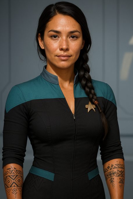 | Physical Description | Tay appears to be in her late-20s, early-30s, a deliberate choice made possible by her El Aurian control over ageing. Her timeless presence exudes a quiet strength and ageless beauty that draws both respect and curiosity. She stands at approximately 5'8" (173 cm) with a balanced, athletic build—toned by centuries of active service, ceremonial movement, and healing work. Her skin is warm-toned and sun-bronzed, carrying the hue of her Oneida ancestry, with faint golden undertones inherited from her El Aurian lineage. Her dark eyes, almost black, are calm and perceptive, as if always listening. They carry the grief of lost worlds and the wisdom of having endured them. Her hair is long, black, and softly wavy, usually worn loose or in traditional braids wrapped with tokens—beads, feathers, or finely woven cords gifted to her over the centuries. A few silver strands frame her face, not from age, but as a symbol of memory and chosen grace. Etched delicately into her skin are traditional Haudenosaunee tattoos, each with personal and cultural significance. These include fine linework along her forearms, symbolising her lineage, her role as a healer, and her connection to Earth. Each design is subtle and elegant, visible only when she chooses to reveal them. Her voice is low and melodic, rich with patience and clarity. She speaks softly but purposefully, often leaving space in conversation for others to reflect. Her body language is composed, every movement considered, conveying a deep inner stillness that can calm even the most agitated patients or colleagues. When off duty, she wears earth-toned garments inspired by Indigenous design, blending flowing fabrics with handcrafted elements. On duty, she wears her Starfleet medical uniform with small modifications: a bracelet carved from bone and onyx, a family pendant tucked beneath her collar, and—on rare ceremonial occasions—a woven sash passed down from her mother. |